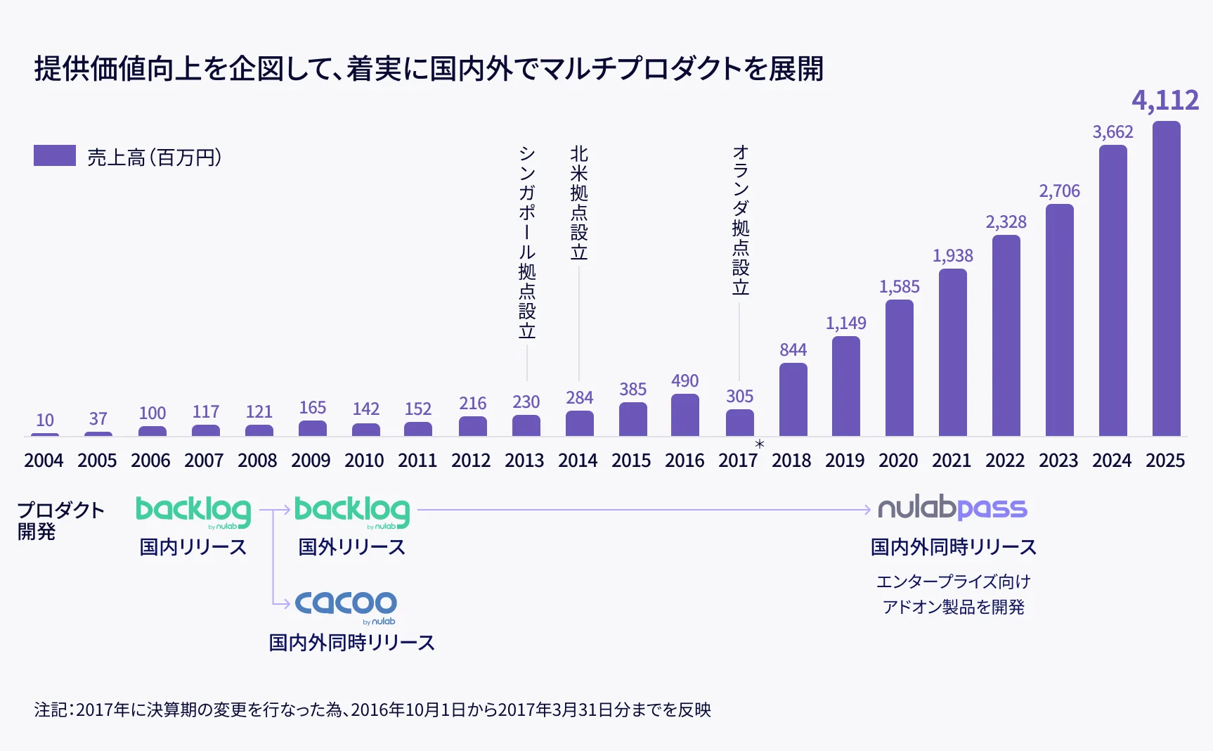 2004年の創業以来、段階的にサービスを展開してきました。国内外の拠点設立とサービスの改善により成長を続け、2025年3月期の売上高は41億円を達成しています。