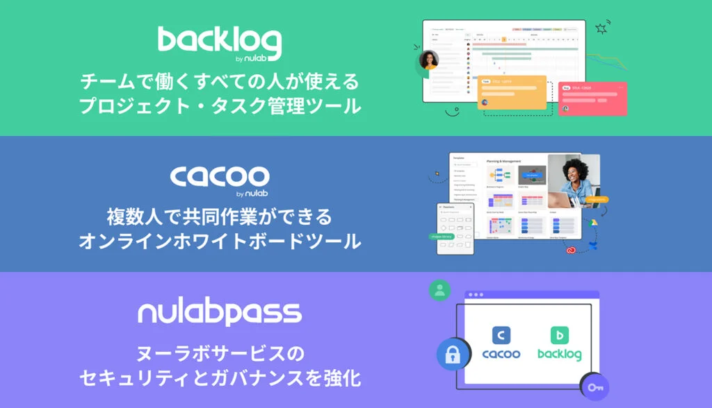 主なサービスは、プロジェクト・タスク管理ツール「Backlog」、オンラインホワイトボードツール「Cacoo」、組織の情報セキュリティ・ガバナンスを高める「Nulab Pass」の3つです。これらのサービスを通じて、「このチームで一緒に仕事できてよかった」という体験を世界中に広めることを目指しています。