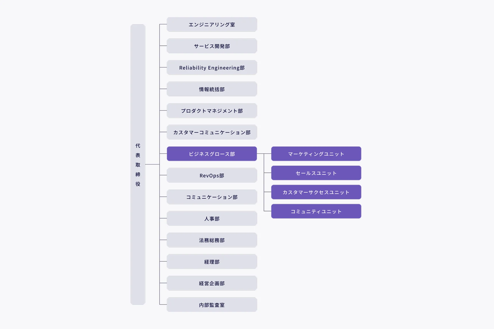 ビジネスグロース部は、マーケティングユニット、セールスユニット、カスタマーサクセスユニット、コミュニティユニットの4つの課で構成され、顧客の課題解決を中心に事業の成長を支える役割を担っています。