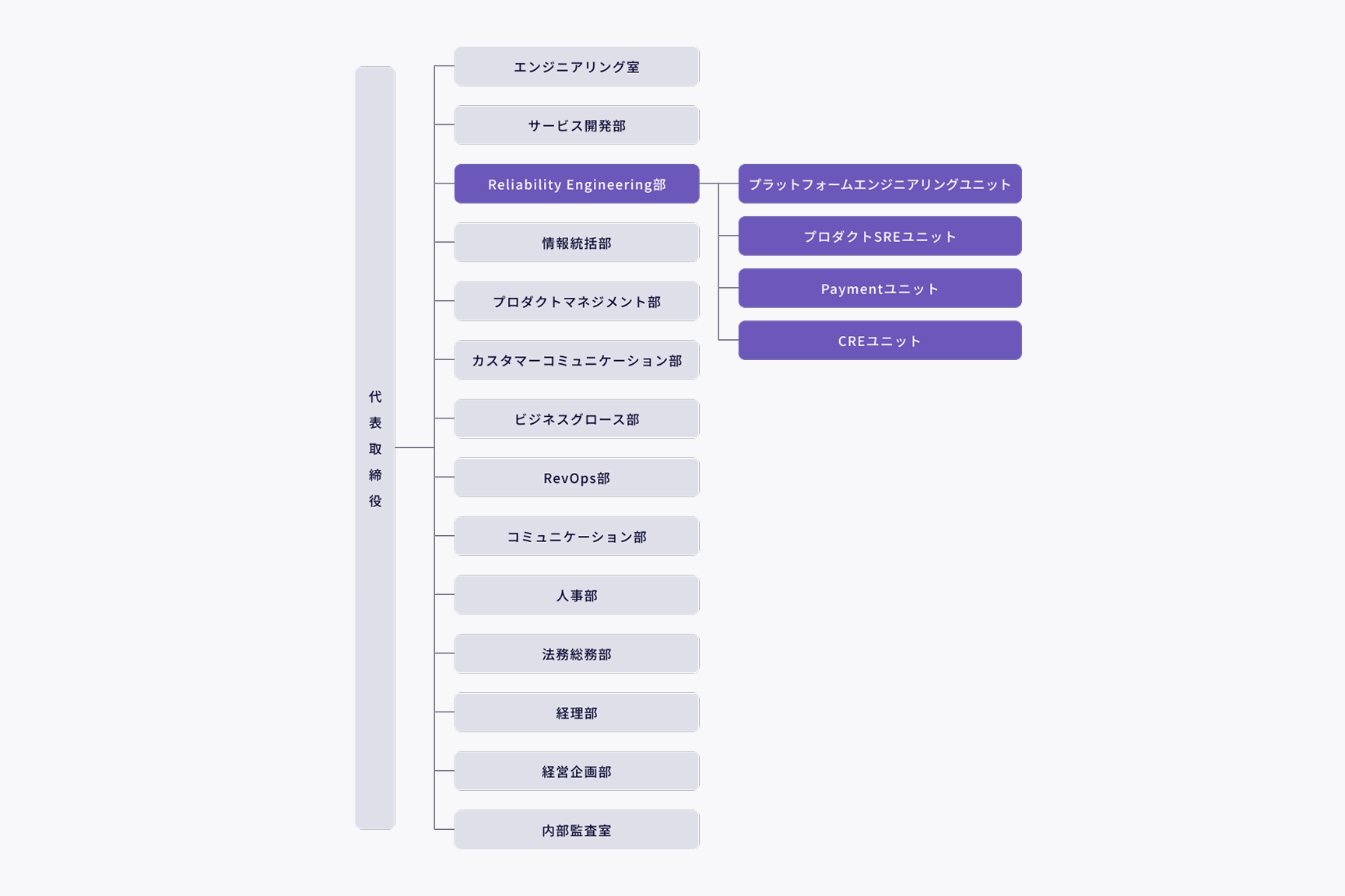Reliability Engineering部は、全体の開発基盤を整備する 「プラットフォームエンジニアリングユニット」 、各プロダクトの運用と信頼性向上を担当する 「プロダクトSREユニット」、 そして「Paymentユニット」、「CREユニット」の4つの課で構成されています。