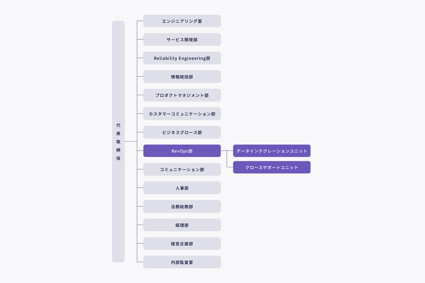 RevOps部は、マーケティング・セールス・カスタマーサクセスだけでなく、サービス開発部門や経営企画とも連携しながら、組織全体の成長を支えることが求められます。データインテグレーションユニットとグロースサポートユニットが連携し、データを基にした施策立案や業務改善を進めることで、全社的なオペレーションの最適化に貢献できます。職種やチームの垣根を越えて課題解決に取り組めるのは、ヌーラボのRevOpsならではの経験です。