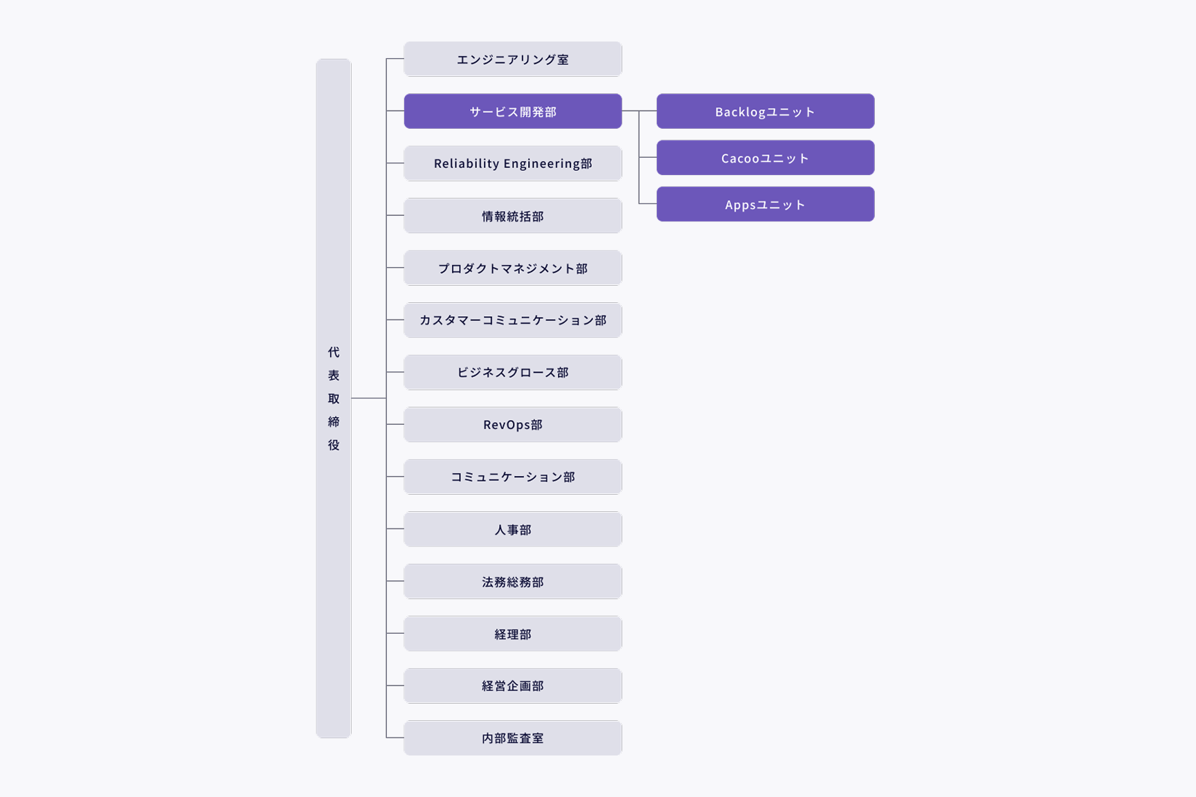 サービス開発部は、プロダクトごとに「Backlog課」「Cacoo課」「Apps課」に分かれています。